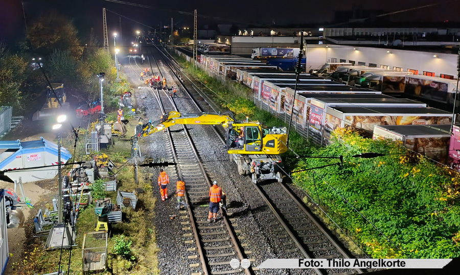 | Mittlerweile ist die Dunkelheit am 8.November 2025 über die Baustelle hereingebrochen. Altschwellen / Schotterwagen / DGU Schotter- planiermaschine und Stopfer | |