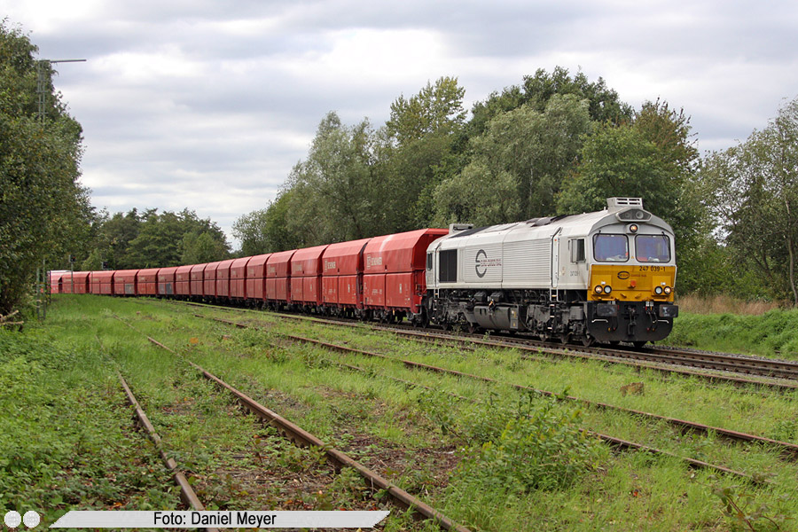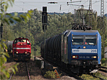 | Die Deutsche Bahn ist mit Lokomotiven der Baureihe 294 (Montags-Freitags) und der Baureihe 232, seltener mit Lokomotiven der Baureihe 225 und Baureihe 247, vertreten. Von Ende August bis Mitte Oktober 2011 fuhr scheinbar, was in Oberhausen gerade verfügbar war. 225 , 232 und 247 |