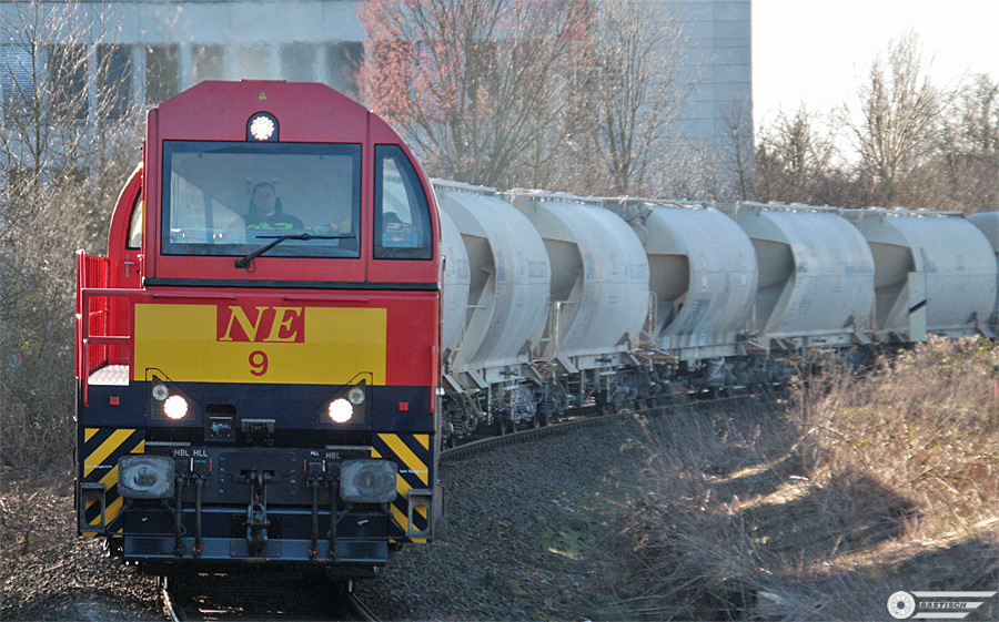 | Die Neusser Eisenbahn fährt Kalksteinmehlzüge zu den RWE Rheinbraun Kraftwerken im rheinischen Braunkohlenrevier |