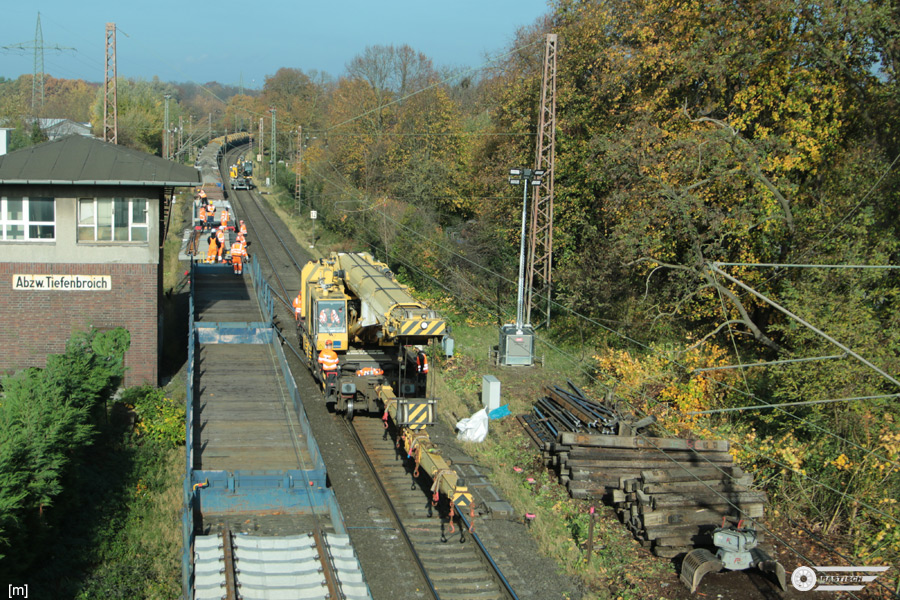 | Am 05.07.2025 wurden auf der Angertalbahn Schwellen im Bereich der Abzweigstelle Tiefenbroich ausgetauscht. Weiterhin standen Sh2 Scheiben nahe km 0,6 Strecke 2405 und km 0,8 Strecke 2404. Ein Gleislagefehler Höhe Freibad Ratingen wurde beseitigt und am 07.07.2025 wurde ein Kabelkanal der Westbahn unter der Angertalbahn auf die östliche Seite nahe km 0,9 (2405) verlegt. >KLICK mehr dazu . Stand 07.08.2025 - Nach einem Monat immer noch Langsamfahrstelle Abzw. Tiefenbroich bis km 0,8 Höchstgeschwindigkeit 10 km/h | ||