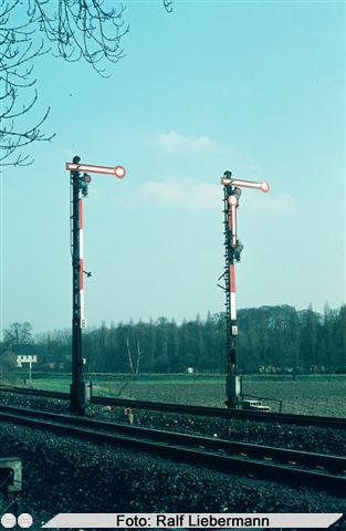 | Zustand in den 1970er Jahren - Von links nach rechts Zur Fahrt von Abzw Tiefenbroich nach Hofermühle gab es das Blocksignal B (Hp0 oder Hp1) , von Ratingen West nach Hofermühle das Blocksignal A (Hp0 oder Hp2) und aus Richtung Hofermühle das Blocksignal C mit den beiden Fahrtmöglichkeiten nach Tiefenbroich (Hp0 oder Hp1) und Ratingen West (Hp0 oder Hp2) |