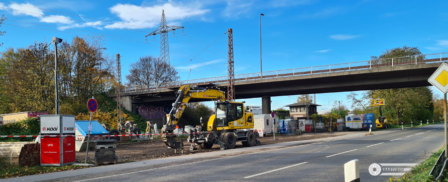 | 07.11.2025 - Da es keinen Platz auf der Baustelle der KAF Falkenhahn an der Abzweigstelle Tiefenbroich gab stellte EIFFAGE 100 Stahlschwellen am Übergang Junkernbuschweg ab. Bagger und sonstige Geräte standen auf dem Parkplatz am Freibad. | |