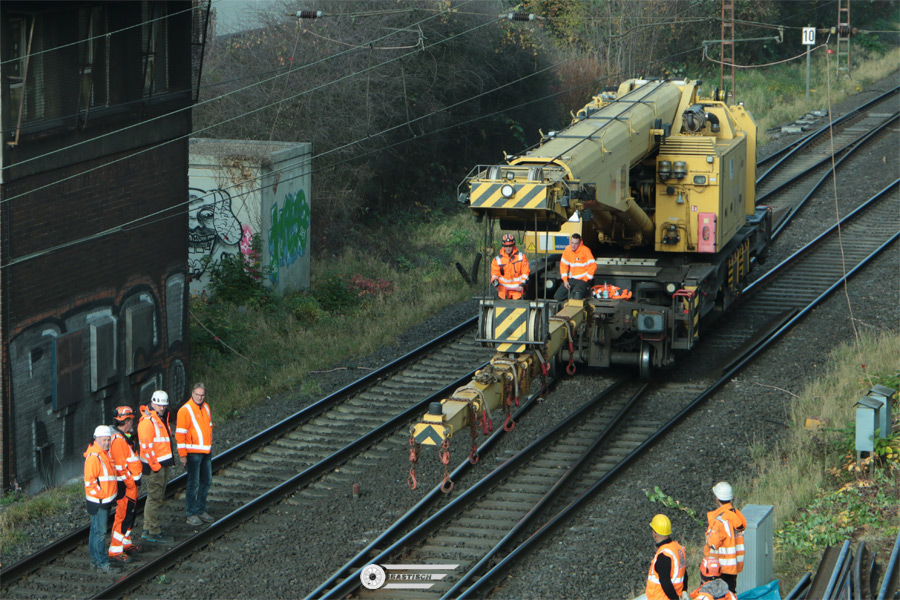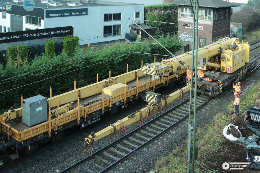 | KIROW-Kran der Hering Bau kommt als Selbstfahrer vom Bauzugende (dieser hatte Richtung Ratingen West vorgezogen) zur Abzweigstelle Tiefenbroich. D-HGUI 99 80 9419 010-0 und wechselt ins Richtungsgleis Duisburg | |