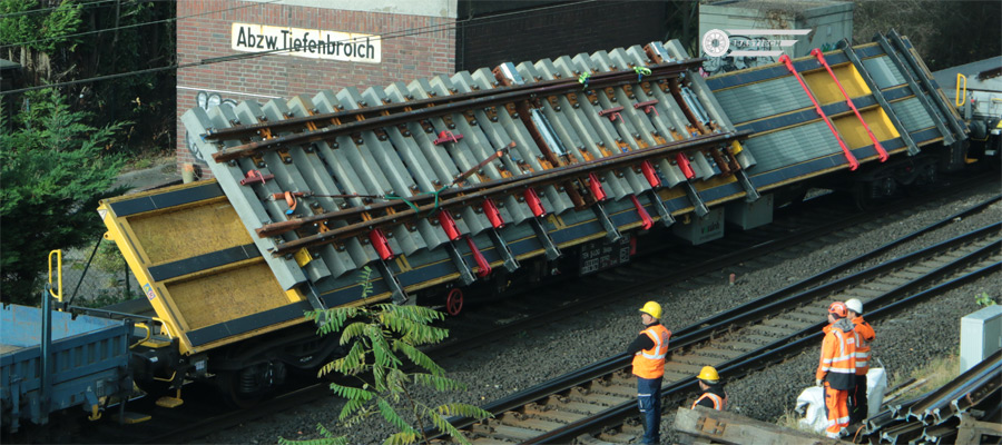 | Direkt hinter 271 022 Weichentransportwagen der Vossloh Rail Services Deutschland GmbH mit zwei weiteren Weichenteilen. | |