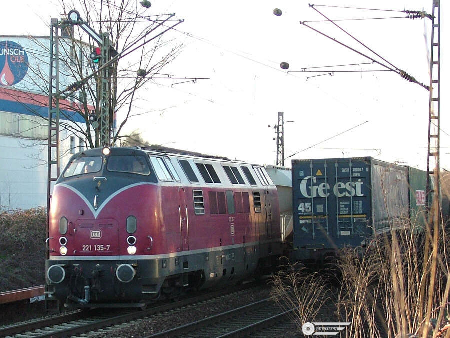 | 221 135 ersetzt zur Zeit Lok 9 der Neusser Eisenbahn im Kalkverkehr nach Rohdenhaus links: 3.April 2006 in Lintorf Link zu einer separaten Seite über den Fahrtrichtungswechsel in Lintorf rechts: 5.April 2006 bei km 16,4 |
