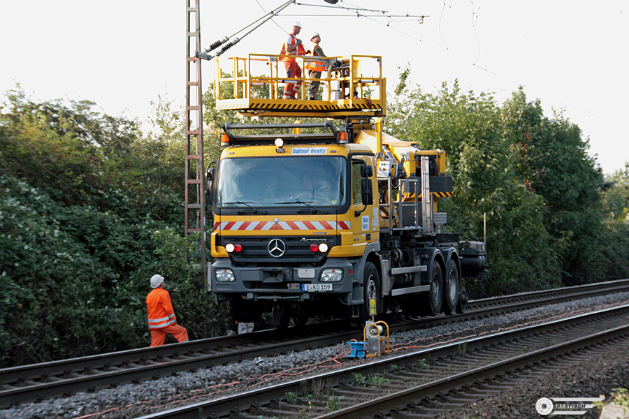 Zweiwegefahrzeug auf Basis eines Mercedes ACTROS aus dem Hause Schörling Brock (heute Hilton Kommunal) - nördlich des Bahnübergangs an der Tiefenbroicher Strasse