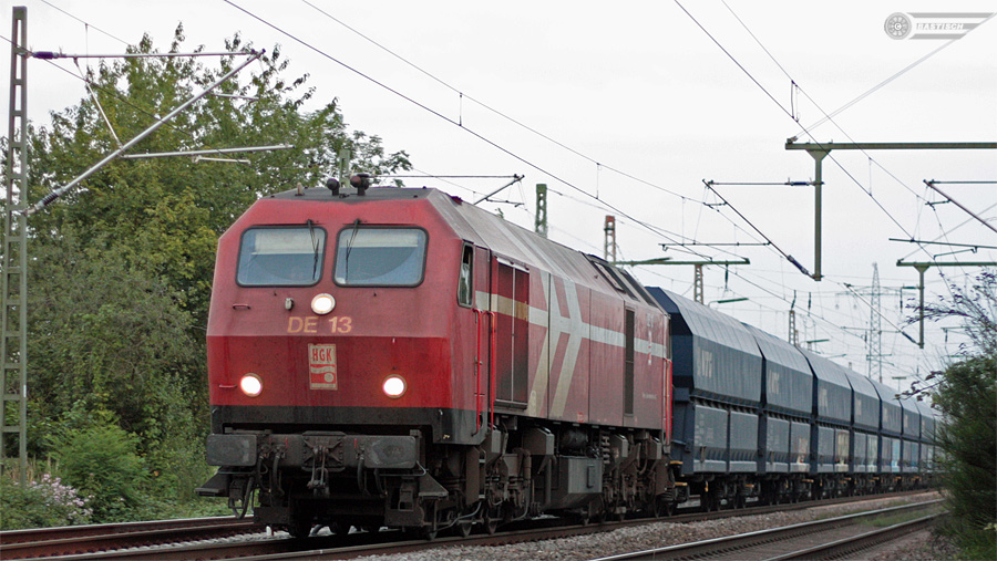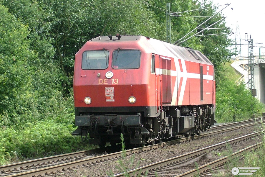 DE 13 am 22.Juli 2008 Lz durch Lintorf Richtung Duisburg. Eine Woche später musste die Lok, die letzte ihrer Bauart, angeblich mit einem Motorschaden abgestellt werden (am 3.August 2008 wieder in Lintorf gesichtet).