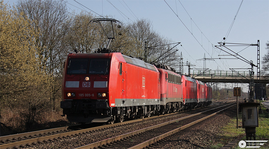 | 25.03.2012 - 185 005 mit 139 246, 185 374, 185 310 und 185 238 kurz hinter Lintorf - Fahrtrichtung Duisburg | |||