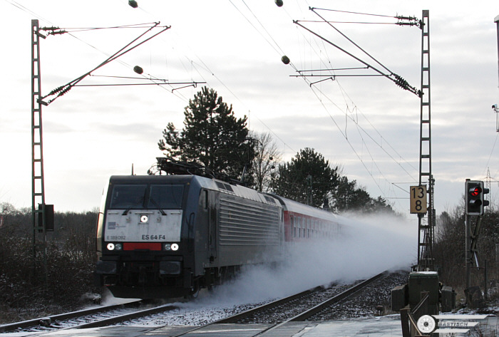 | 1. Februar 2009 Kurz, ganz kurz, gab es noch einmal Schnee. Bei den ersten Zügen, die zu diesem Zeitpunkt über die Strecke fuhren, gab es "erfrischendes" Schneegestöber für an der Strecke Wartende. Links: 189 092 mit |