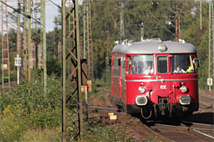 | Entgegen der Ankündigung auf der Internetseite des Veranstalters (Zitat): bieten wir auch die Anreise mit dem MAN-Schienenbus VT9 aus dem Oleftal an. Die Abfahrt erfolgt ab Schleiden um ca. 8.10 Uhr. Die Wagen aus Bonn-Beuel und aus dem Oleftal werden in Köln-Mülheim vereinigt und gemeinsam geht es dann weiter zur Zeche Zollverein war am 16.06.2012 nur der VT 25 der RSE unterwegs Link dazu www.rse-express.de |
