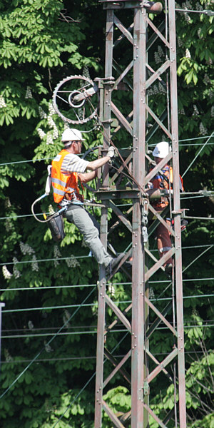 | Entsorgung Oberleitung Am 20. April 2009 begann der Abbau überflüssiger Oberleitungen in Lintorf. Die Gleise, die sie überspannten, sind seit 2007 nicht mehr mit dem restlichen Gleisnetz verbunden bzw. schon Jahre vorher zurückgebaut worden. Kletternd am Mast, mit Leitern und schliesslich mit Hilfe einer Teleskop-Arbeitsbühne wurden die ungenutzten Leitungen von den Tragwerken getrennt. |