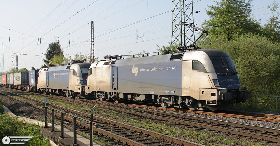 | ES 64 U2 - 022 und ES 64 U2 - 027 am 20.April 2009 per Fahrt im Gegengleis ab Rath auf der Fahrt Richtung Duisburg. Hier in Lintorf auf das Ausweichgleis (Gleis 3) wechselnd. Es ging fast im Kriechgang Richtung Halt zeigendem Signal. Die im Hintergrund sichtbare 151er-Doppeltraktion war mit ihrem Coilzug zu früh zum Stillstand gekommen und musste für den WLB-Zug weiter vorziehen. | ||