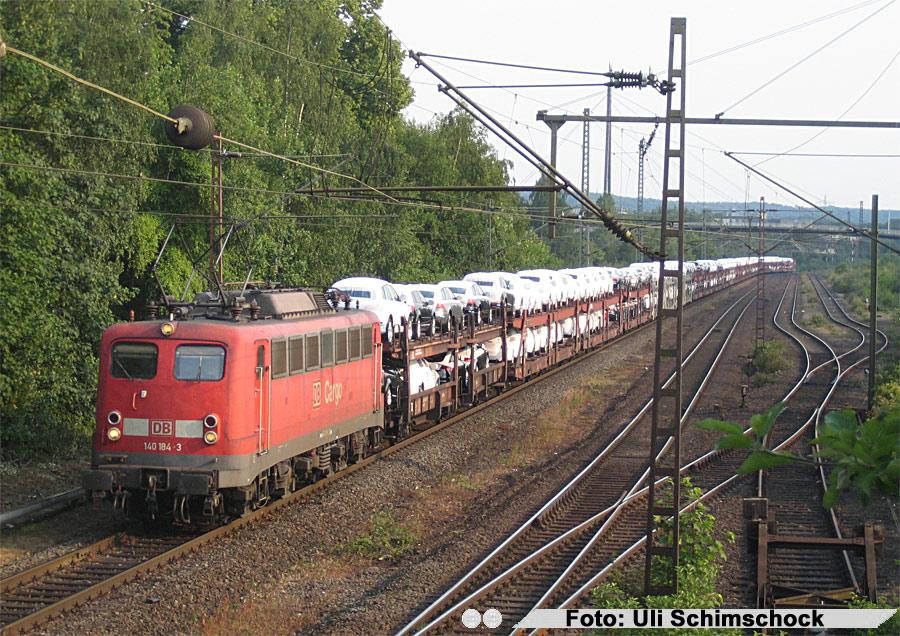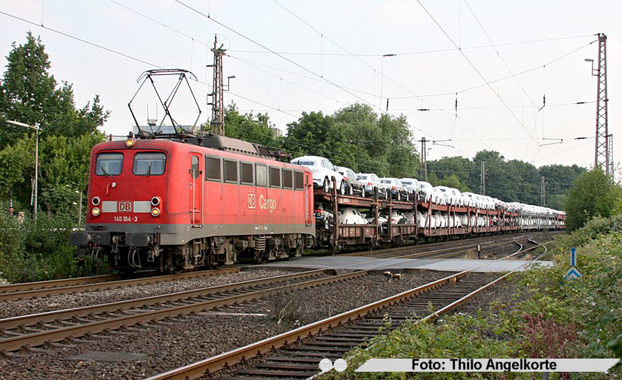 140 184 mit Audi-Zug am Bahnübergang Sandstrasse in Ratingen Fahrtrichtung Duisburg am 24.Juni 2010