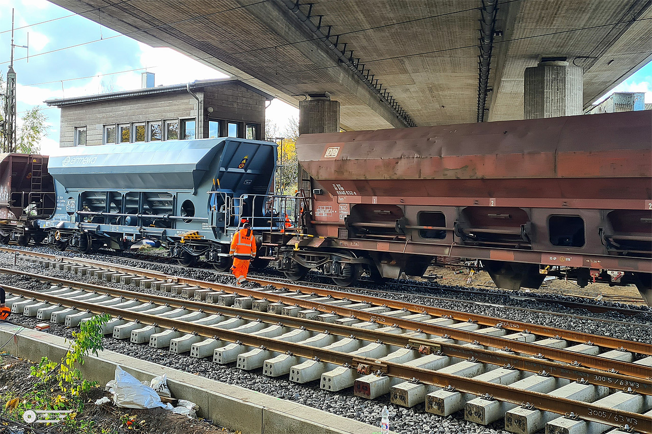 | 293 006 mit den Schotterwagen fährt über die Weichenverbindung |