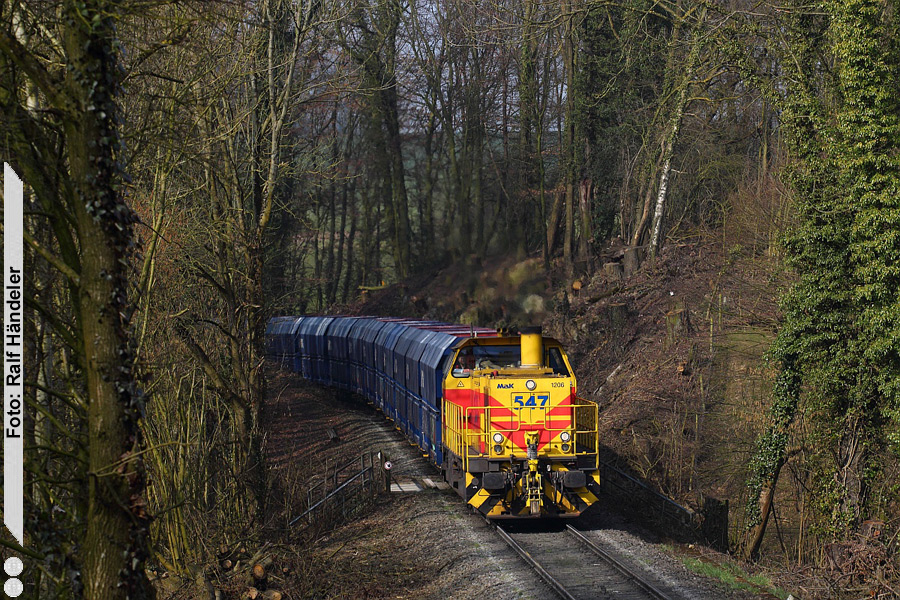 26.März 2015 -Kalkzug mit ThyssenKrupp Lok 544 nahe der Brücke der A3 über das Angertal