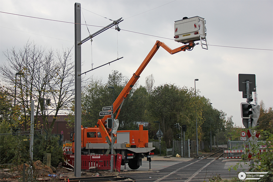 Am 3.November 2017 wurde das Tragseil über dem Gleis Richtung Rather Bahnhof angebracht.